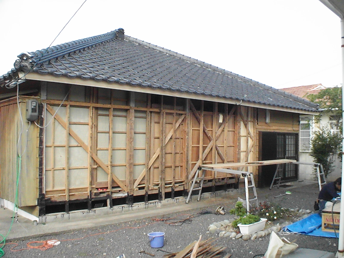 既存の古い板壁を剥がし構造補強・断熱材入れ
