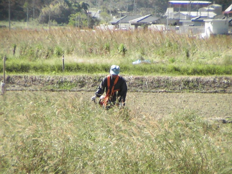 背丈ほど伸びた雑草の刈取り作業